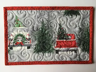 I wasn't very productive today, but I did manage to make a couple of Christmas Mug Rugs. I've been wanting to do this since I got the fabric, but finally decided that today was the day! They came out cute, and I just had to use the last bit of this cute Christmas print.