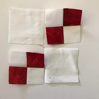 Cut two 1 1/4 inch strips from the pieces for the 3 inch block, or two 2 inch strips if you are making the 6 inch block. Sew these strips into small four patch blocks. Press seams as desired. Squares will finish at 2 inches for 3 inch block and at 3 1/2 inches for 6 inch block. Measuring as you go helps make sure your blocks finish at the correct size!